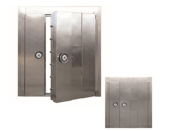 金庫門是一種特殊的防盜門,其防盜防護性能遠遠大于防盜門。金庫門選用 超厚防爆鋼板,特種防鉆合金板和標準槽鋼、進口不銹鋼板、進口密碼鎖(可按用戶需要選配高、中、低檔鎖具),及特種填充料等利用先進設(shè)備加工而成,足以能抵御、阻止目前先進而強硬的攻擊手段;并配置日閘門和備用小門,能確保庫內(nèi)財產(chǎn)的安全。